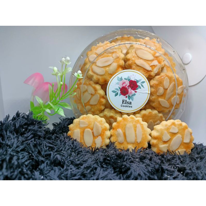 COOKIES ALMOND dibuat dengan bahan² premium yang dipanggang secara perlahan sehingga matang merata. Kue ini dibuat menggunakan kombinasi butter wisman dan blueband serta almond premium yang ditabur di atas kue Bahan-bahan yang digunakan berkualitas tinggi dan dijaga kesegarannya.