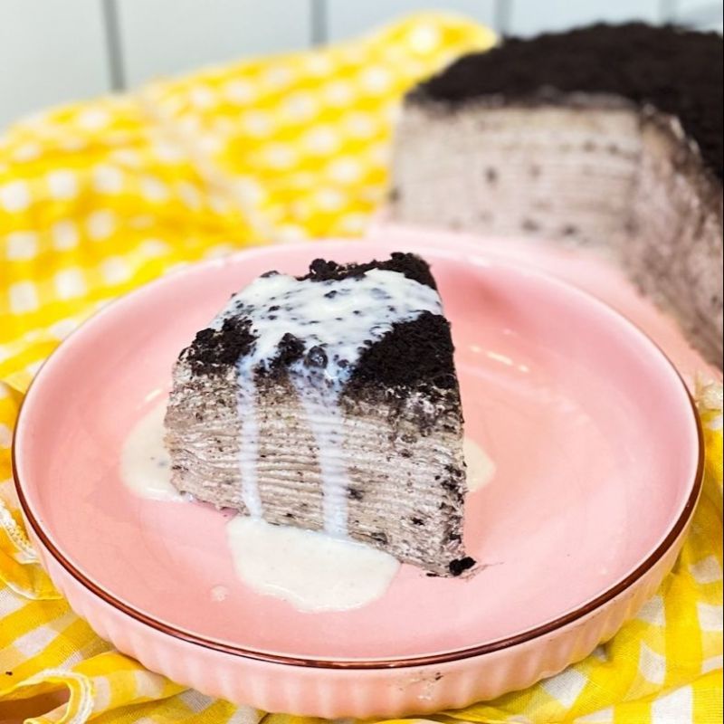 Lapisan crepes yang diberi white choco cream dan ditaburi oreo