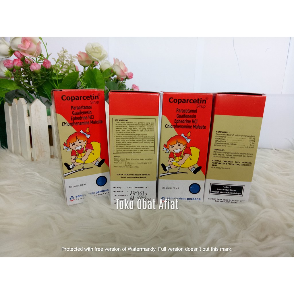 COPARCETIN SIRUP mengandung beberapa zat khasiat antara lain parasetamol, guaifenesin, ephedrin, CTM, Ethanol yang berkhasiat untuk meringankan gejala - gejala flu seperti demam, sakit kepala, hidung tersumbat dan bersin - bersin yang disertai batuk pada anak - anak umur 6 - 12 tahun.