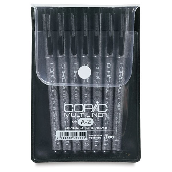 Copic Multiliner Pens are fine quality inking pens available in a variety of sizes and styles. The pigment-based ink is waterproof and won't bleed or smear when used with Copic Markers. These quick-drying pens are ideal for anime, illustration, cartooning, pen-and-ink drawing, scrapbooking, and other detail work. Copic's polyester nibs won't roll or bend, and they're housed in a durable plastic case with "click fit" caps that prevent dryout. They're great for use as a complement to Copic Sketch Markers (sold separately). Each Multiliner Set A-2 case includes one Black pen in each of seven standard sizes: 0.03 mm, 0.05 mm, 0.1 mm, 0.3 mm, 0.5 mm, 0.8 mm, and 1.0 mm. KETERANGAN: