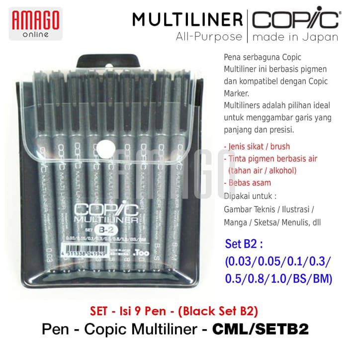 Pena serbaguna Copic Multiliner ini berbasis pigmen dan kompatibel dengan Copic Marker. Multiliner juga kedap-air, tinta tidak akan tercampur dengan air setelah garis pena benar-benar kering.