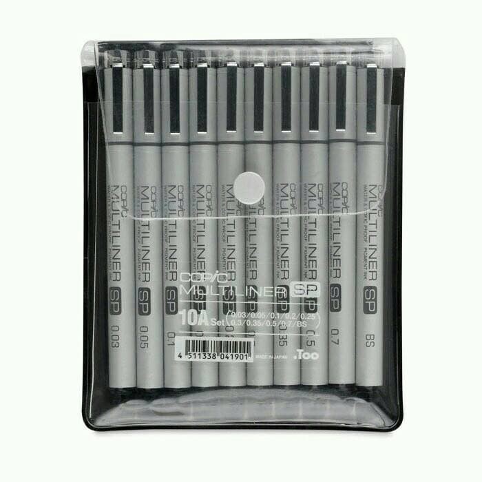Pigment-based drawing pen yang tahan air dan anti bleber. Memiliki goresan presisi dan aliran tinta yang konsisten. Didesain sempurna dengan gagang alumunium kokoh dan keren. Dalam set ini terdapat 10 ukuran nib untuk memenuhi kebutuhan gambar Anda.