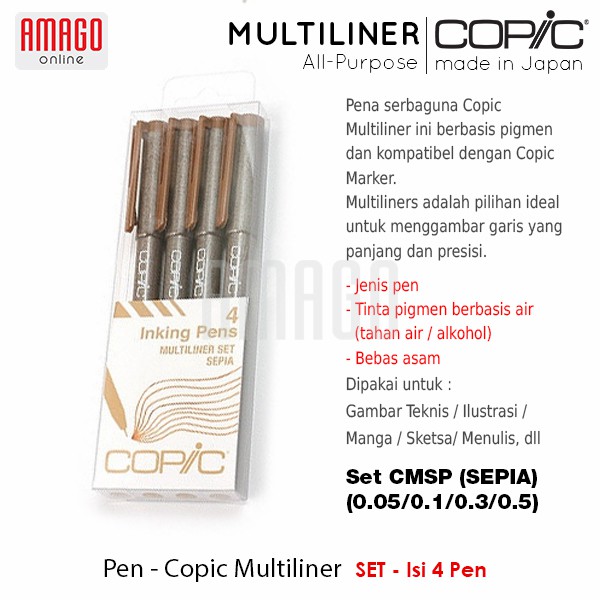 Pena serbaguna Copic Multiliner ini berbasis pigmen dan kompatibel dengan Copic Marker. Multiliner juga kedap-air, tinta tidak akan tercampur dengan air setelah garis pena benar-benar kering.