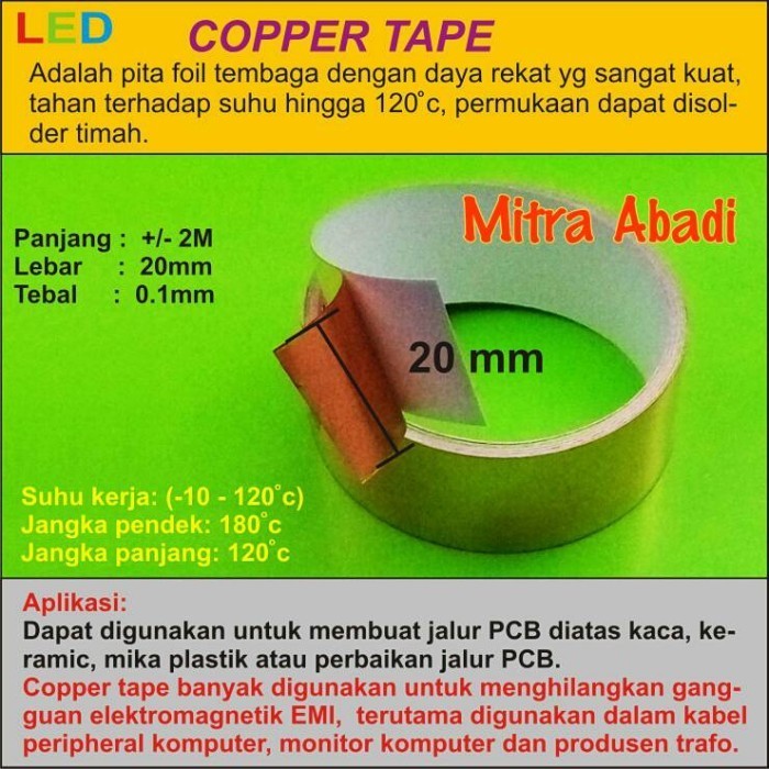 Copper Tape adalah pita foil tembaga dengan daya rekat yang sangat kuat, tahan terhadap suhu hingga 120 Derajat Celcius, permukaan dapat disolder timah