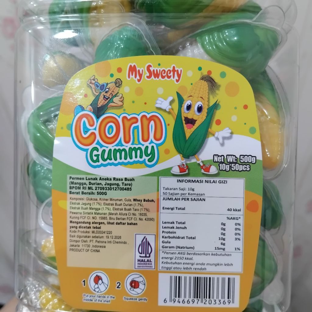 CORN GUMMY PERMEN LUNAK ANEKA RASA BUAH dengan bentuk corn yang cute hadir dalam kemasan yang menarik.