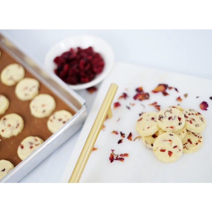 - Terbuat dari French butter, dried rose petals, dan dried cranberries.