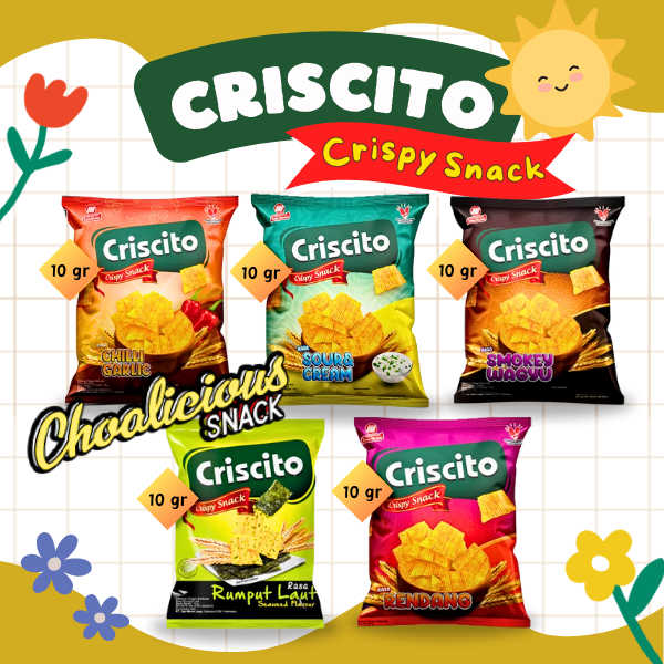 CRISCITO Crispy Snack Rasa Chilli Garlic/Sour Cream/Smokey Wagyu/Rumput Laut/Rendang Makanan Ringan @10 gr