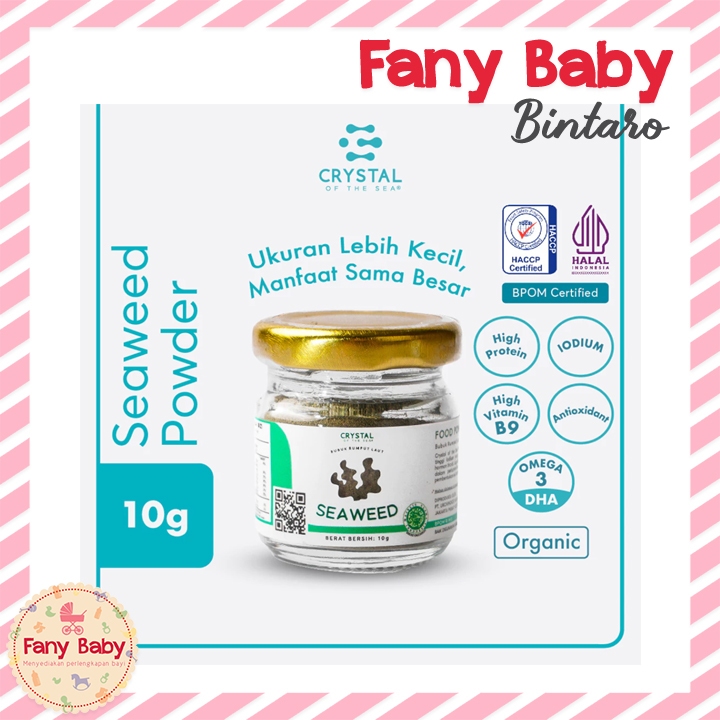 Seaweed Powder (Bubuk Rumput Laut) dari Crystal of the Sea terbuat dari perpaduan Nori & Wakame kualitas premium tanpa tambahan garam, gula, MSG atau bahan-bahan lainnya. Kaya akan kandungan Iodium, Omega-3, Asam Folat / Vitamin B9, Protein dan Antioksidan.