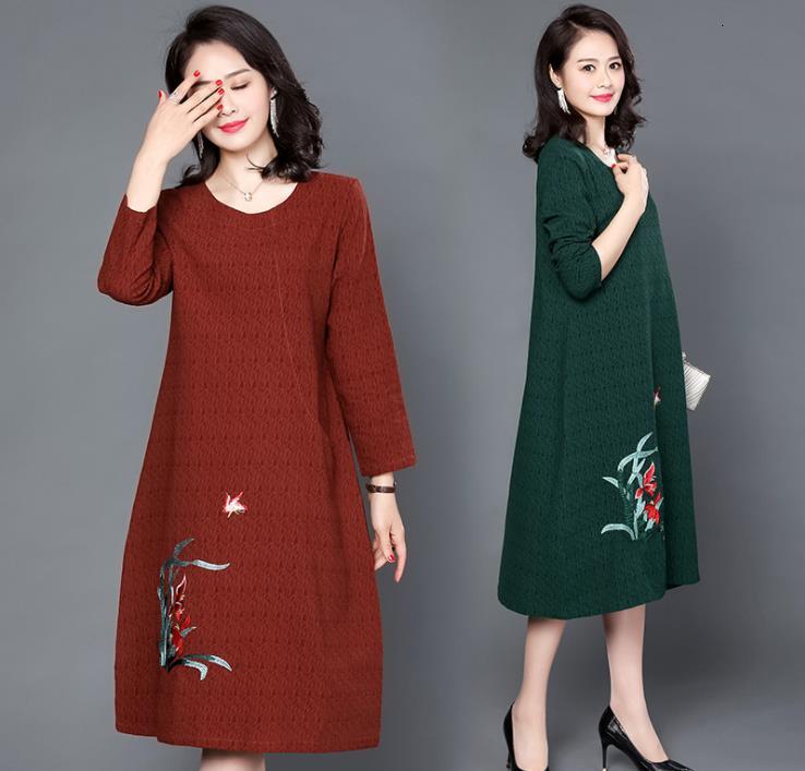 Women Retro Dress Printed Loose Long Sleeve Maxi Dress with Pockets for Women A-line Ankle Length Plus Size Pullover Lady Dress