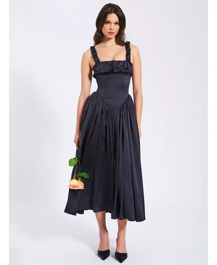 Женское вечернее платье без рукавов, черное атласное ТРАПЕЦИЕВИДНОЕ ПЛАТЬЕ с открытыми плечами и оборками, платье для выпускного вечера
