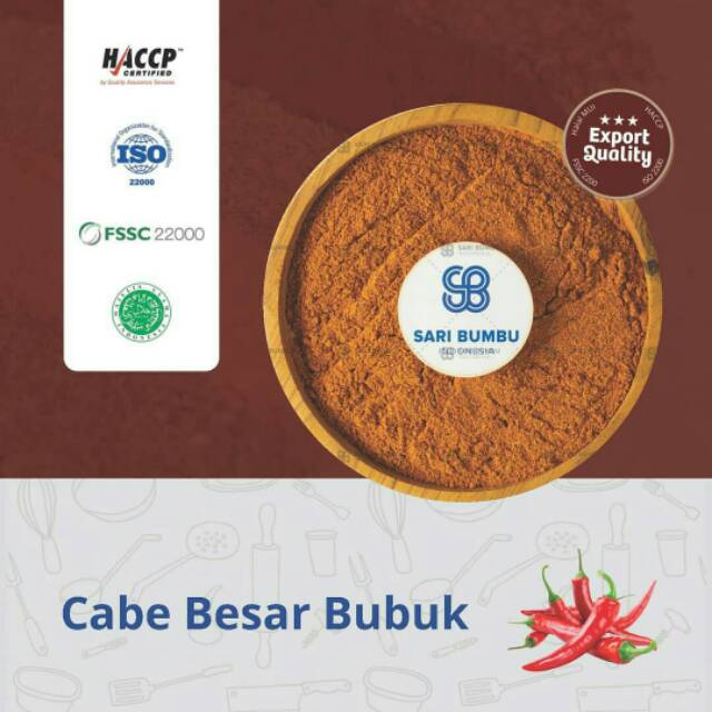 Cabe Besar Bubuk yang di proses dengan sangat higienis dengan standar mutu Internasional. Cabe Besar Bubuk ini sumber yang sangat baik dari vitamin A dan C, dan serat sumber, makanan yang baik kalium dan zat besi. Cabe besar bubuk bisa sebagai pereda nyeri, menurunkan kolesterol, meningkatkan kekebalan tubuh, membantu mengobati jenis kanker tertentu, mencegah bisul, membantu penurunan berat badan, dan menurunkan risiko diabetes. Rasanya yang pedas karena kandungan senyawa capsaicin di dalamnya membuat cabai menjadi salah satu bumbu dapur terfavorit di beberapa negara. Bisa untuk campuran bumbu barbecue, saus barbecue,masakan balado, rica-rica, kari untuk menambah cita rasa pedas.