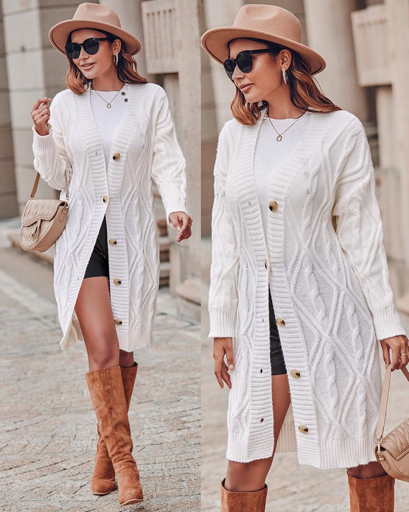 Cable Knit Buttoned Long Sleeve Cardigan, White