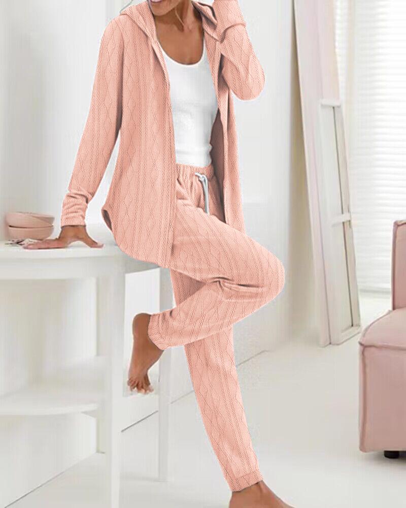 Cable Textured Hooded Top & Drawstring Pants Set, Pink