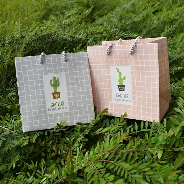 Kantong kertas (paper bag) dengan gambar tumbuhan kaktus memiliki 2 warna lembut yaitu abu-abu dan pink. Gunakan untuk memberikan bingkisan / kado atau sekedar pengganti kantong biasa. Bahan kantong terbuat dari kertas karton tebal sehingga tidak mudah koyak.