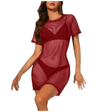 EHTMSAK Mesh Lingerie for Women Nightwear See Through Sexy Strap Chemise Short Sleeve Teddy Lingerie Red L