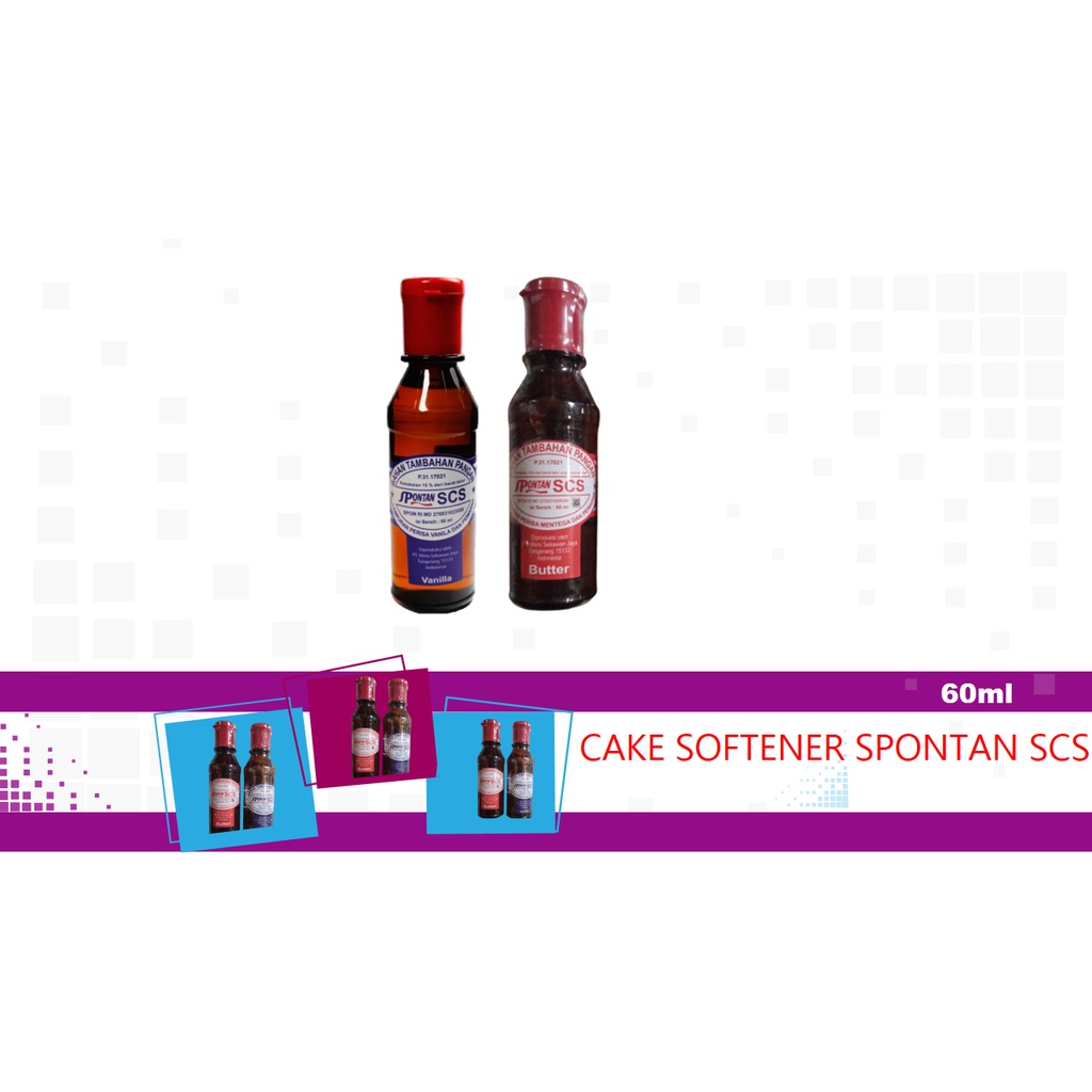 Spontan Cake Softener (SCS) adalah bahan tambahan berbentuk cairan yang berfungsi untuk melembabkan dan melembutkan cake serta menghilangkan bau amis telur. - Adonan Cake lebih lembut dan menghilangkan bau amis telur.