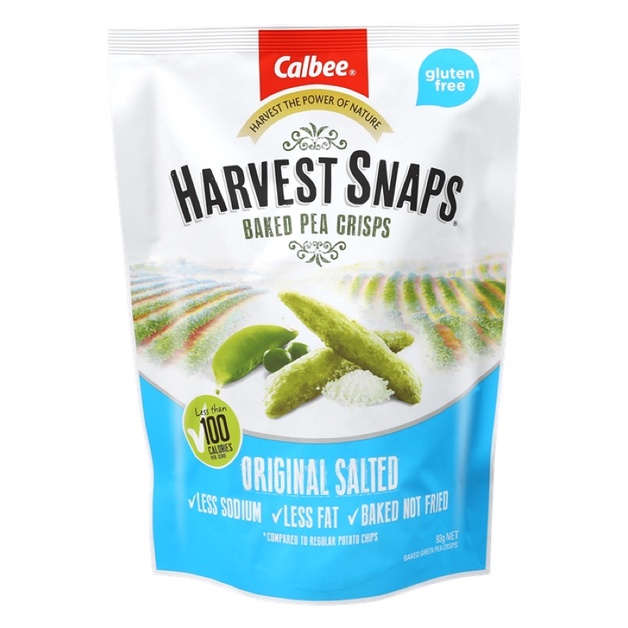 Tasty baked Original Salted Harvest Snaps contain less fat, less sodium, and more fiber compared to regular potato chips!