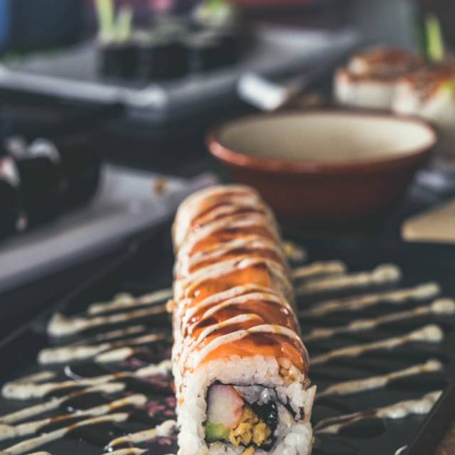 Crab Meat , Kyuri , Tanuki Sushi Roll Topped With Raw Salmon Sprinkled With Tobiko ( Isi 8 Potong, Pedas, Mentah)
