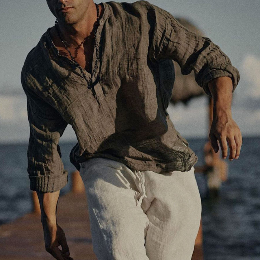 Camicia A Maniche Lunghe Da Uomo In Lino Collo Semiaperto