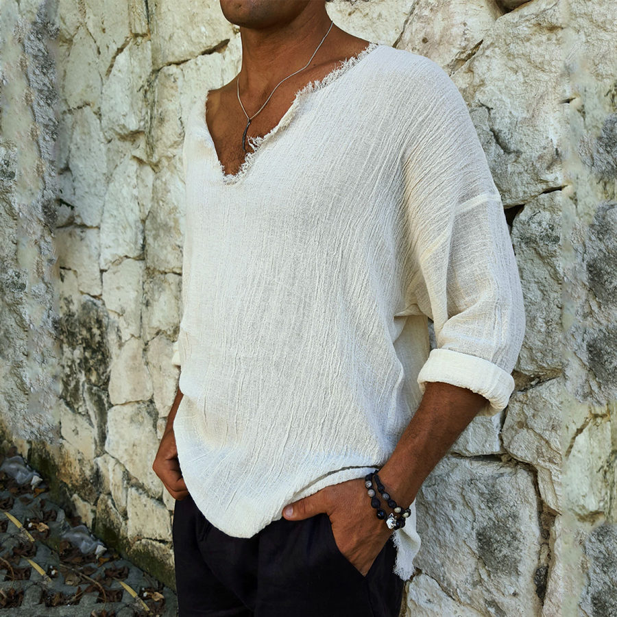 Camicia Da Uomo A Maniche Lunghe In Lino Con Scollo A V