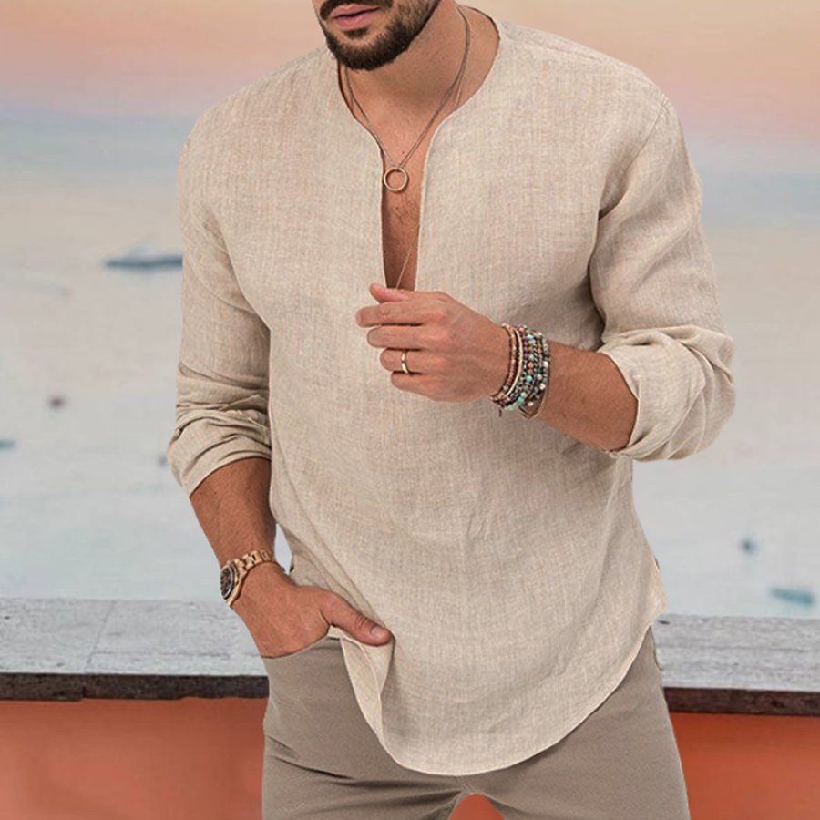 magliette e camicie,camicia in lino a maniche lunghe con collo basso