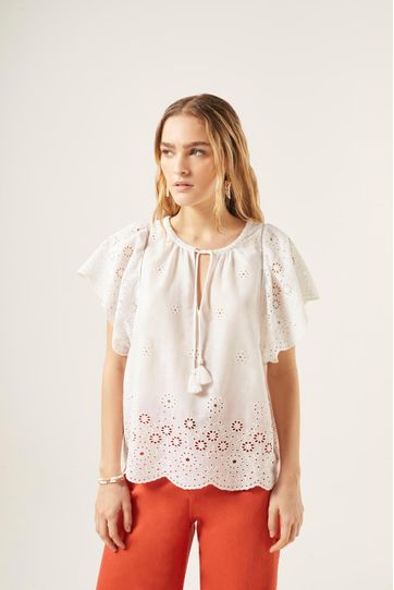 Top confeccionado en algodón, de manga corta levemente acampanada, con cuello redondo y escote en v con lazos para cerrarlo. De corte amplio y detalles de broderie en mangas y ruedo. Un clásico de la marca, versátil y súper combinable, que se renueva en textura y confección.