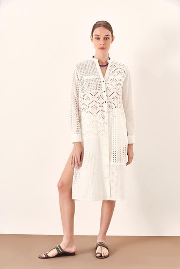 Camisa a la rodilla manga larga, confeccionada en distintos tipos de broderie tipo patchwork, con cuello redondo y en V y tajos en los costados. Podés usarla sola como vestido sobre el traje de baño, o con pantalones blancos en un total look monocromo súper canchero.