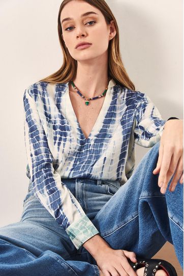 Camisa manga larga confeccionada en viscosa estampada con tye dye. De cuello mao en V y moldería recta, podés combinarla con nuestros jeans oxford para un total look de inspiración seventies.