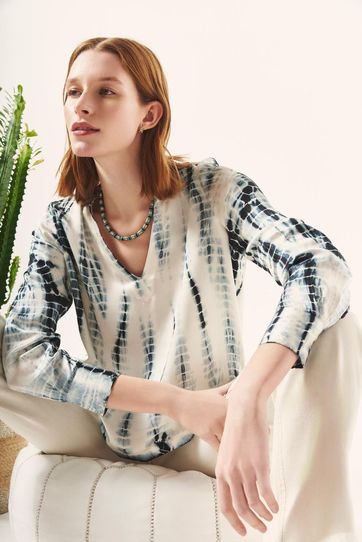 Camisa en viscosa con teñido tie dye, cuello mao y escote en V. De mangas largas y amplias terminadas con puño y botón. Su estampa le brinda color y una impronta súper veraniega.