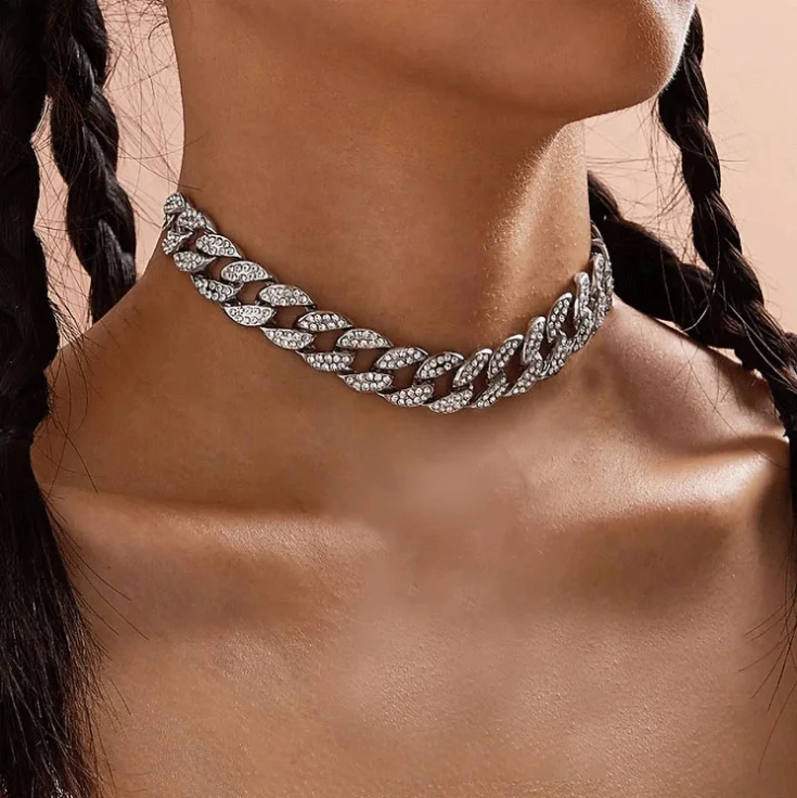 Fashion New gold chain jewelry for men Crystal Rhinestones Miami hip hop Cuban link chain silver womens Gold Plated Necklace, Picture