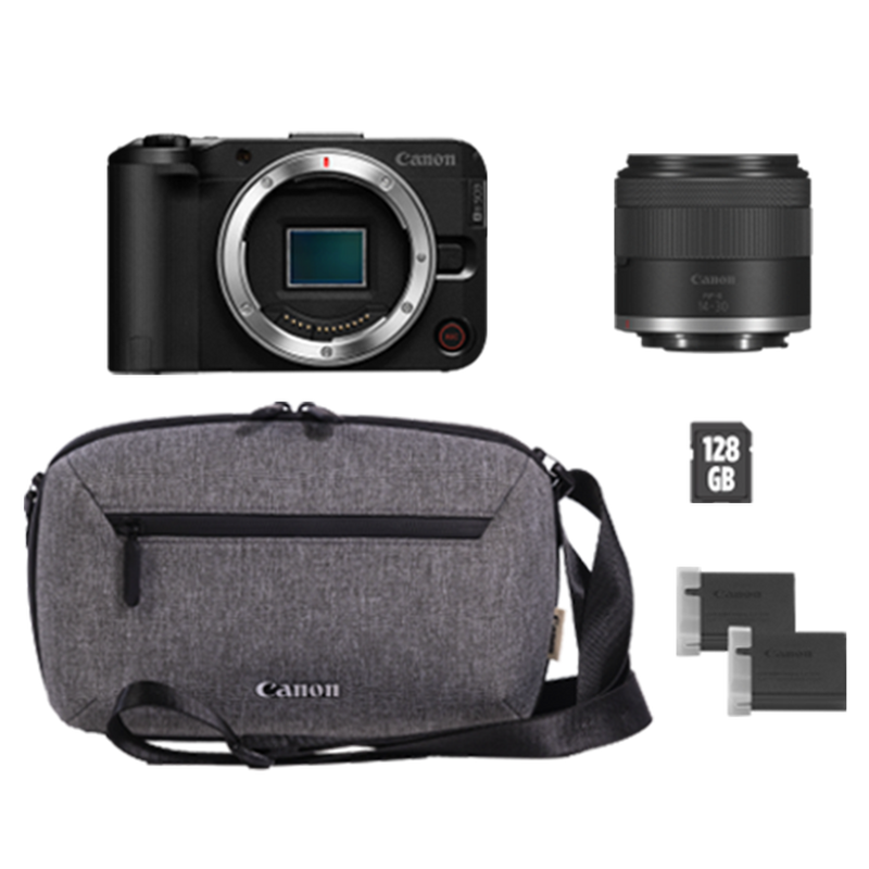 Canon EOS R50 V Mirrorless Camera + RF-S 14-30mm F4-6.3 IS STM PZ Lens + Backpack + SD Card + Spare Battery