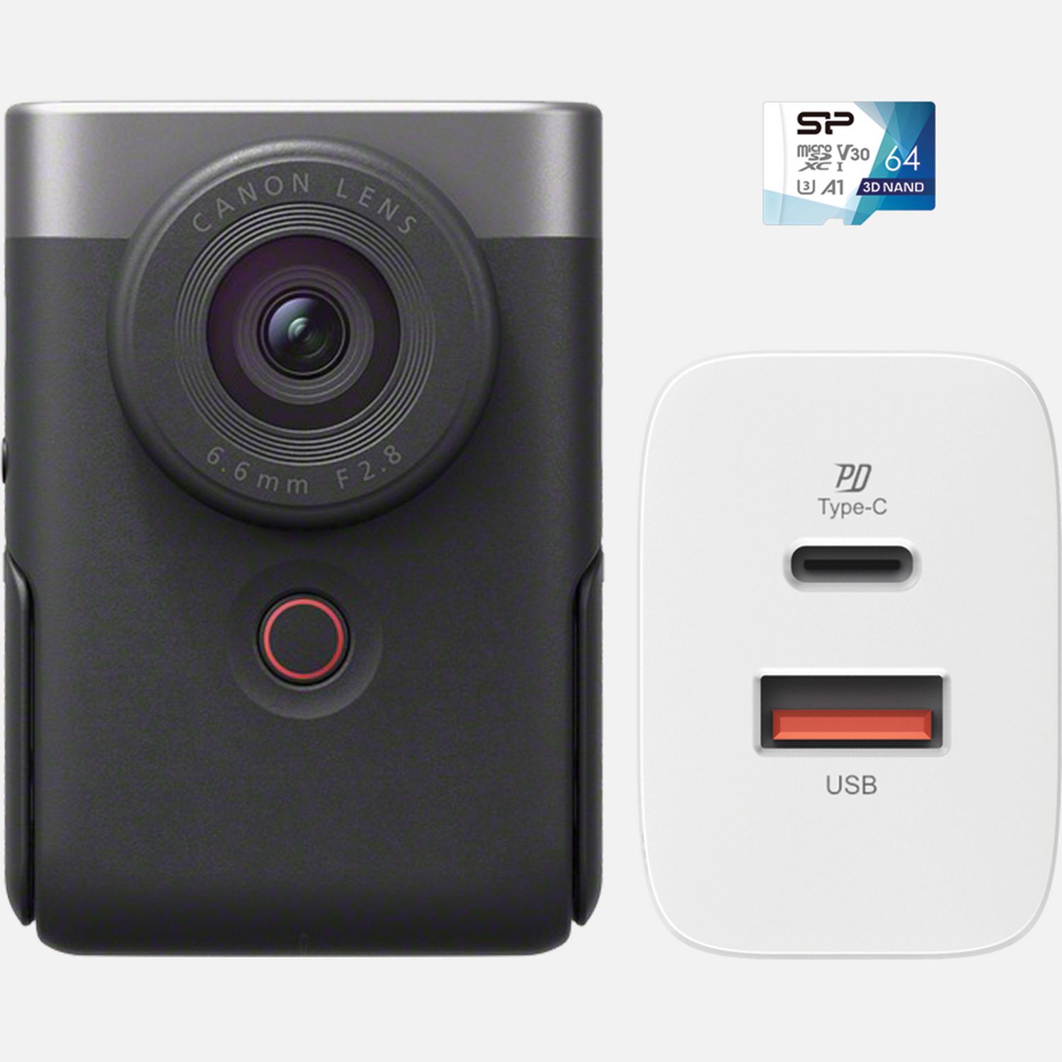 Stand out online and stay discreet while recording content with the PowerShot V10, Canons all-in-one 4K vlogging camera. Everything you need for vlogging is built-in a tilt-screen, large stereo microphones and even a stand so youre ready to roll in seconds, yet its lightweight and compact enough to fit in your pocket or a small bag. Impress subscribers with shake-free content that looks great both in bright and low light. Capture the atmosphere and every word clearly with the powerful microphones plus a wind filter. Engage your audience by livestreaming on YouTube and Facebook via the Canon Camera Connect app on your smartphone. Even record over Wi-Fi or use the camera as your webcam for added versatility. Pocketable all-in-one Get comfortable vlogging with this small (63.4 90.0 34.3 mm weighing at 211 g) dedicated camera that creates a discreet and enjoyable vlogging experience. Look good from all angles Record hands-free from in the kitchen or out on an adventure with a built-in multi-position stand that neatly folds away. Create engaging content Impress your audience with shake-free 4K UHD content that looks great both in bright and low light. Never worry about being out of shot thanks to the built-in wide-angle lens with an f/2.8 max aperture. Sound simply superb Capture the atmosphere and every word you say clearly, everywhere you record, with large built-in stereo microphones. A wind filter ensures youre heard, even when the weather is against you. Create your signature style Personalise your videos with 14 colour filters and skin smoothing effects, and access them at the touch of a button. Easy operation Be ready to capture the moment in any fast-paced environment thanks to an intuitive menu and a simple button layout. Enjoy a 2" 180-degree tilted touchscreen for front and back recording. Livestream with ease Get close to your audience in real-time even wirelessly or on-the-go using your mobile data by livestreaming on YouTube and Facebook via the Canon Camera Connect app on your smartphone. Alternatively, use the camera as your webcam for added versatility. Also included in the kit This kit is built for the travelling vlogger. It includes a fast charging US wall-charger with Power Delivery USB-C Type C and USB Type A output, EU, UK and AU Plug Adapters compatible in 150+ countries, and a micro SD Card that lets you record in continuous 4K. What's in the box PowerShot V10 Video Camera Body, Silver PRO V30 64 GB Memory Card with Adapter QM16 20-Watt Wall Charger Multi-Country USB Charging Adapter IFC-100U Interface Cable 2.0 (USB Type C to C cable) Wrist Strap User Manual Kit Specifications Compact and lightweight at 211 g - Hold in your hand, fit in your pocket Quality recording in 4K UHD - Standout, movie-quality content Powerful stereo microphones - Clear audio for immersive sound from all directions Livestream - Livestream to Facebook and YouTube via the Canon Camera Connect app UVC/UAC - Use your camera as a webcam Built-in stand - Shoot steadily from multiple positions Tilt-up screen - 2-inch screen for easier shot composition from both camera sides Movie Digital IS - For sharper, shake-free footage Smooth skin movie mode - Look your best while recording with skin smoothing effects 14 colour filter effects - Add ambiance and hone your vlogging style Remote shooting - Record from nearby over Wi-Fi using your smartphone MicroSDXC - Compatible with microSD, microSDHC and microSDXC memory cards USB-C Charger included in the box Minimum/maximum charging power required by the device: 7.5 W to 15 W See all specifications Awards . .