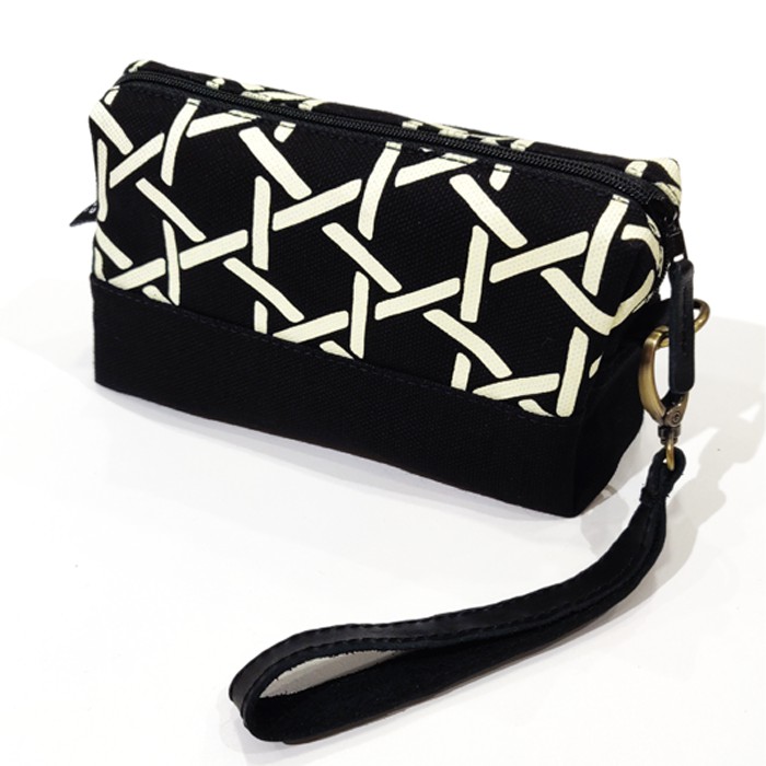 Deskripsi All Purpose Pouch Rope Black Canvas LivingThe All Purpose Pouch is practical for everyday use. Comes with a detachable genuine leather strap.Foam padded, with satin lining, great for cosmetics yet also very safe for gadgets.Dimension: 9cm x 16cm x 5cm.Material:- canvas, screen printed and gloss coated- genuine leather- satin lining- foam pads- brass hook