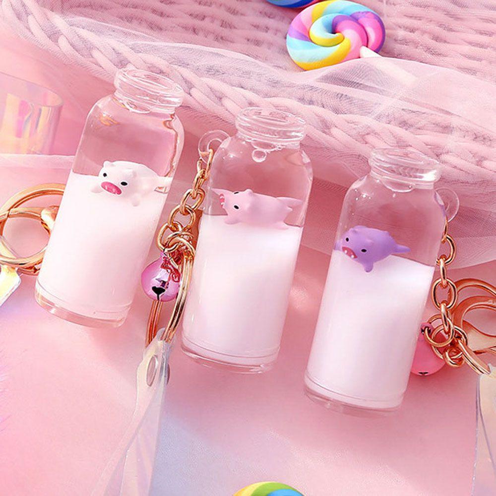Car Accessorie Quicksand Jewelry Milk Bottle Pig Keyfob Key Ring Key Chain Fashion Accessories 3