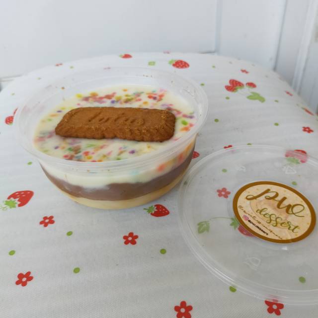 pudding cake caramel dgn biskuit lotus dan dilapisi dgn saus cokelat yg nikmat dgn tambahan white choco ganach dan topping biskuit lotus serta butiran sprinkle yg membuat dessert ini semakin menggodamu..