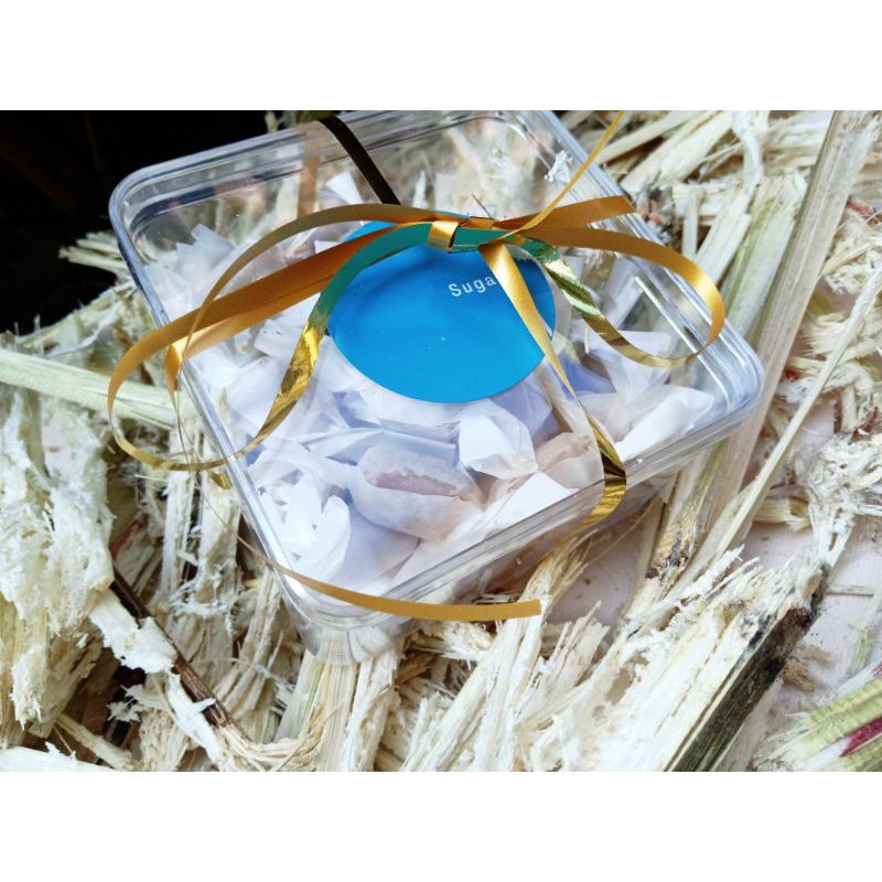 Dikemas dalam toples cantik dengan berat bersih 200gr dan ditempatkan dalam box kardus supaya aman dalam proses antar ke tempat kamu. 30-35pcs