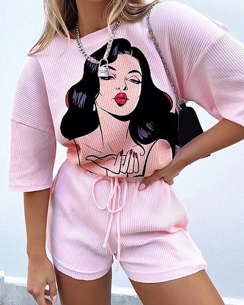 Cartoon Figure Print Ribbed Top & Drawstring Shorts Set, Pink