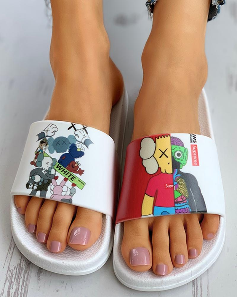 Cartoon Pattern Non-Slip Flat Sandals, White