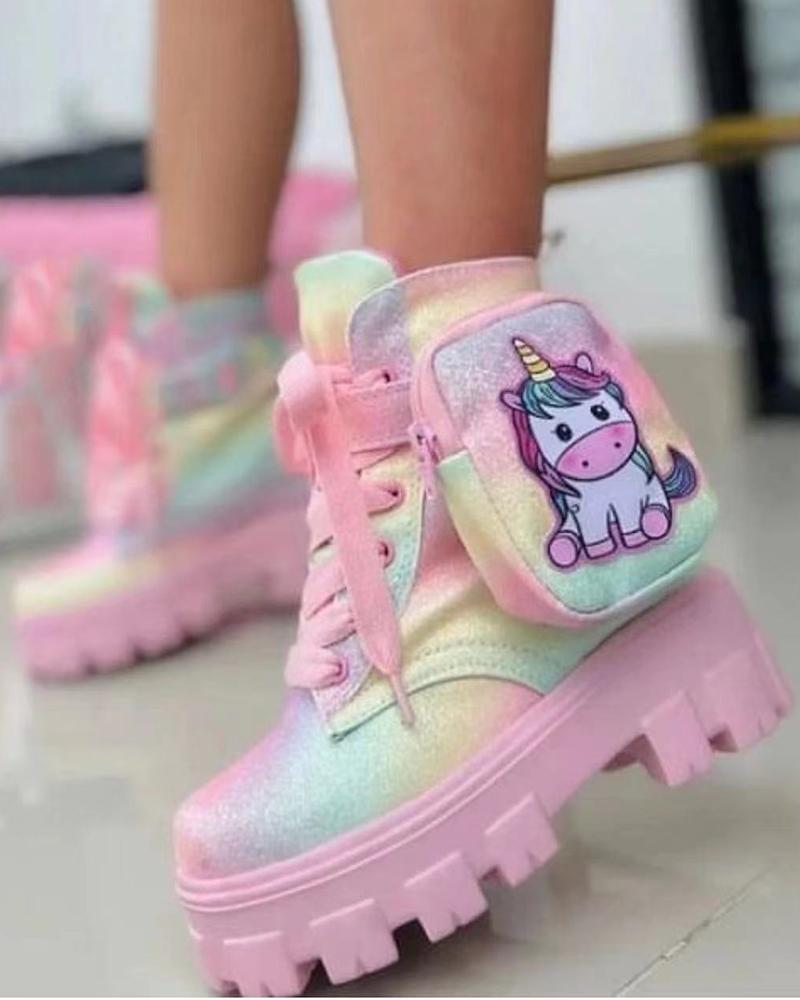 Cartoon Pocket Pattern Lace-up Ankle Boots, Multicolor