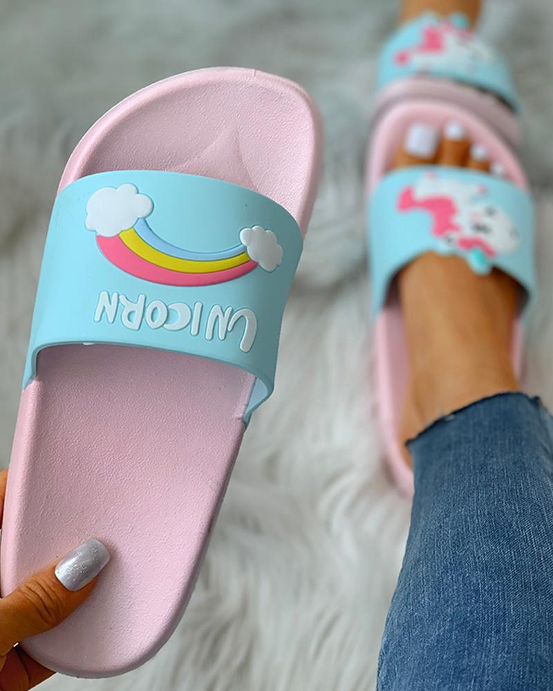 Cartoon Rainbow Pattern Open Toe Flat Sandals, Blue