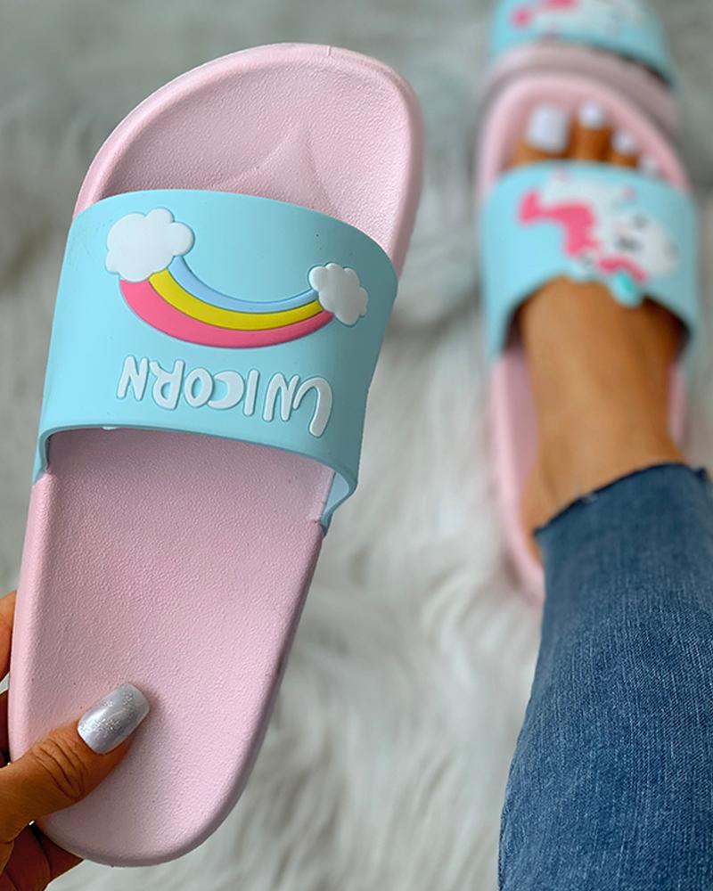 Cartoon Rainbow Pattern Open Toe Flat Sandals, Blue