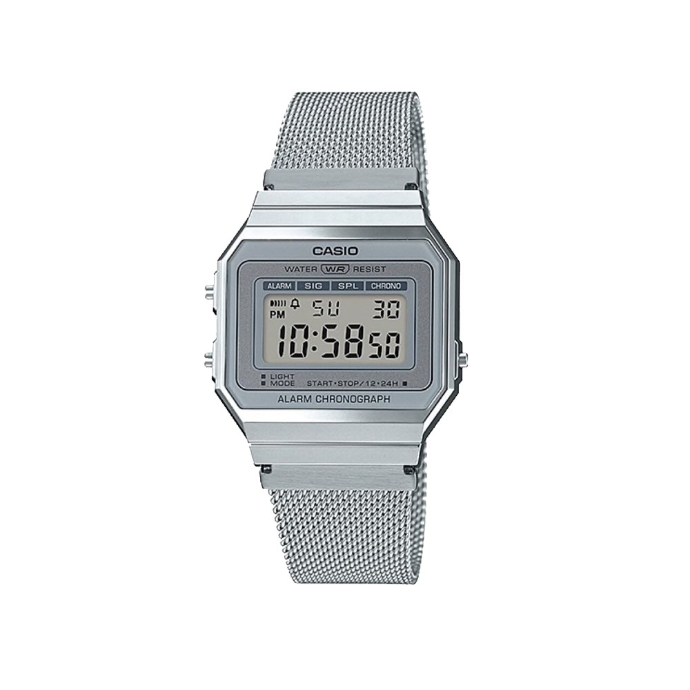 Casio A700WM-7A Kelengkapan:- Kotak Casio- Buku Manual- Kartu Garansi Resmi 1 Tahunspesifikasi: Bahan casing / bezel: Resin Gesper yang Dapat Disetel Tali Jam Tangan Rantai Baja Tahan Karat Kaca Mineral Tahan Air Cahaya latar LED Stopwatch 1/100 detik Kapasitas pengukuran: 59'59.99'' Mode pengukuran: Waktu split, waktu posisi pertama-kedua Alarm harian Sinyal waktu hitungan jam Kalender otomatis (diatur dengan 28 hari untuk Februari) Format 12/24 jam Ketepatan waktu reguler: Jam, menit, detik, pm, tanggal, hari Akurasi: ±30 detik per bulan Perkiraan masa pakai baterai: 3 tahun pada CR1616