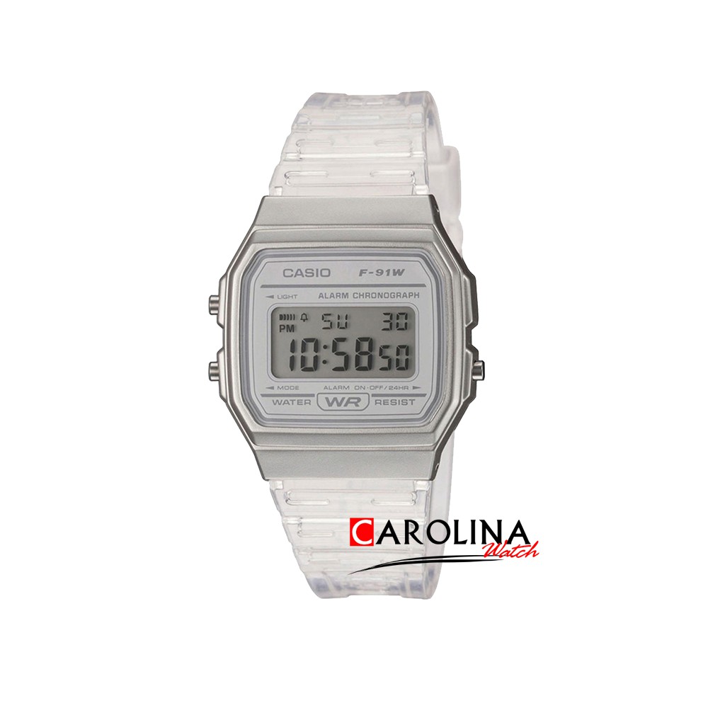 Casio F-91WS-7D Kelengkapan:- Kotak Casio- Buku Manual- Kartu Garansi Resmi 1 TahunSpesifikasi Bahan casing / bezel: Resin Tali Jam Tangan Resin Kaca Resin Tahan Air Lampu LED Stopwatch 1/100 detik Kapasitas pengukuran: 59'59.99 Mode pengukuran: Waktu net, waktu split, waktu posisi pertama-kedua Alarm harian Sinyal waktu hitungan jam Kalender otomatis (diatur dengan 28 hari untuk Februari) Format 12/24 jam Ketepatan waktu reguler: Jam, menit, detik, pm, tanggal, hari Akurasi: ±30 detik per bulan Perkiraan masa pakai baterai: 7 tahun pada CR2016