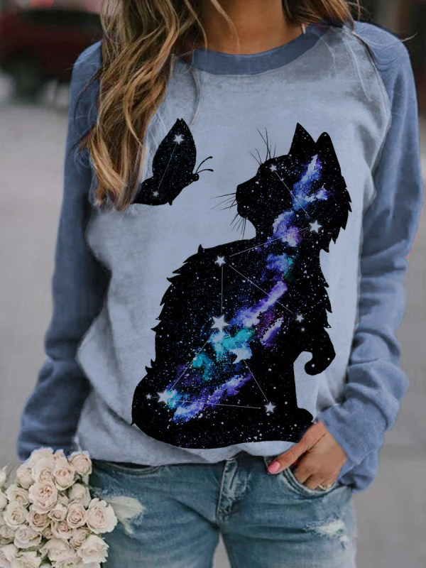 Casual Cat Print Colorblock Sweatershirt