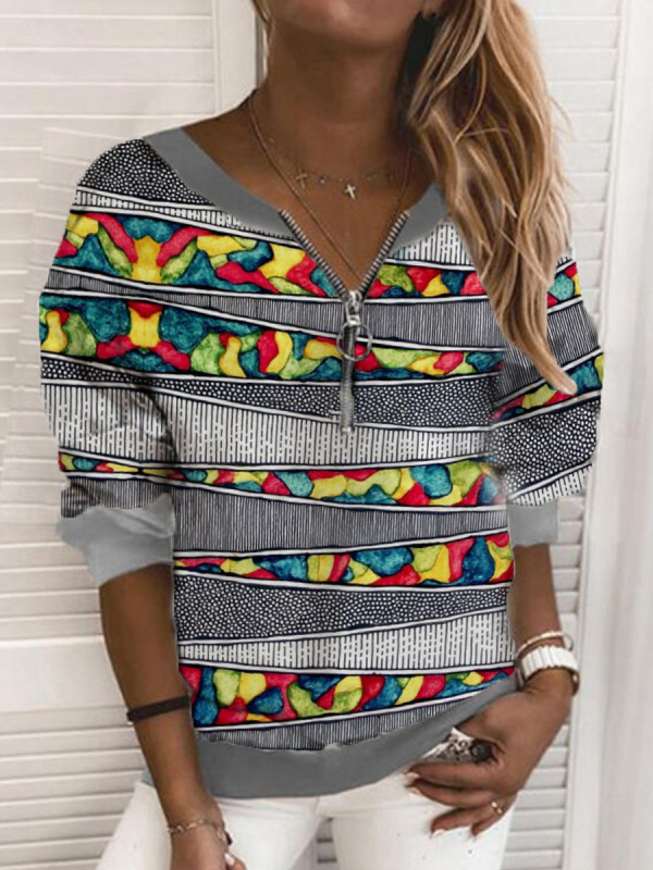 t-shirts,casual colorblock print zipper long sleeve sweatershirt