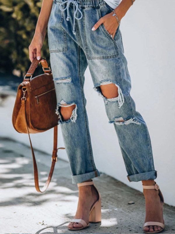 Casual Elastic Waist Ripped Jeans
