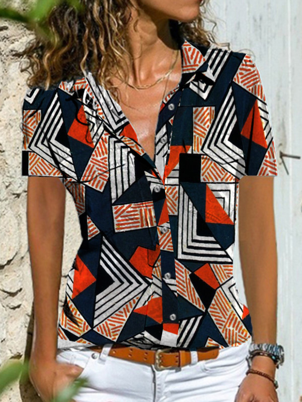 Casual Geometric Print Button-up Short Sleeve Blouse