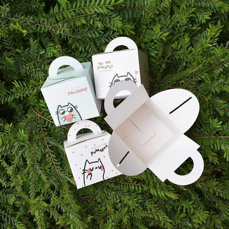 Kotak karton cantik bertemakan kucing yang memiliki beragam ekspresi yang menggemaskan. Datang dalam bentuk lembaran, kamu bisa melipat sendiri menjadi kotak tanpa menggunakan gunting/lem. Gunakan sebagai kotak hadiah pengganti kertas kado.