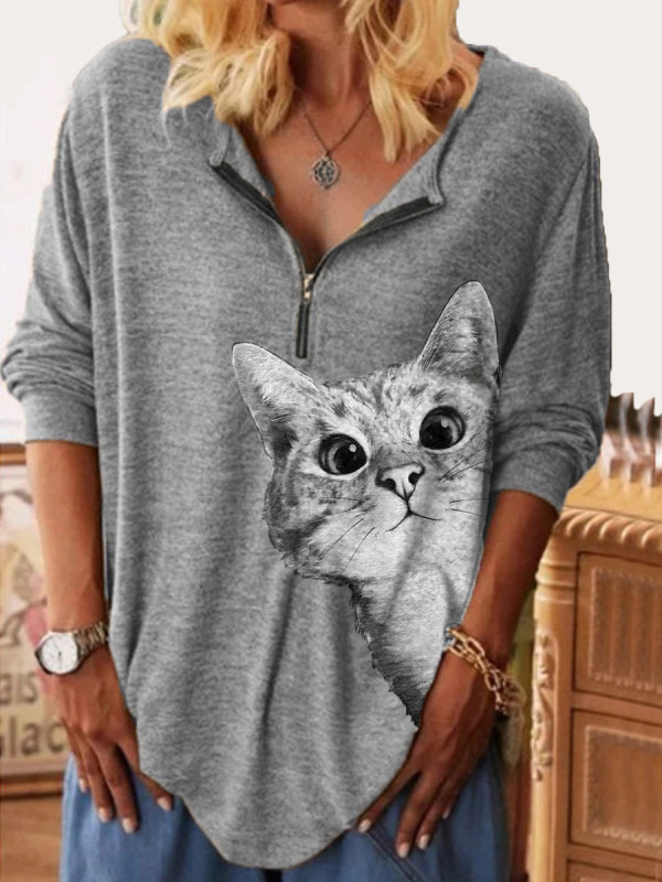 Cat Zipper Casual T-Shirt