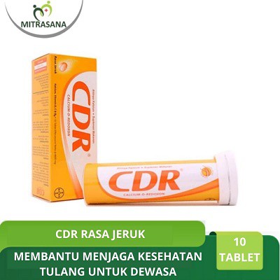 Indikasi UmumSuplementasi Kalsium, Vitamin C, D, B6 agar tulang sehat pada orang dewasa, serta membantu memenuhi kebutuhan kalsium pada ibu hamil dan menyusui. Juga diperlukan untuk masa pertumbuhan, masa penyembuhan, keadaan gizi yang buruk serta gangguan penyerapan makanan.DeskripsiCDR EFFERVESCENT 10 TABLET merupakan suplemen vitamin (meliputi: Vitamin C, D, dan B6) dan mineral agar tulang sehat pada orang dewasa serta membantu memenuhi kebutuhan kalsium pada ibu hamil dan menyusui. Juga diperlukan untuk masa pertumbuhan, masa penyembuhan, keadaan gizi yang buruk, serta gangguan penyerapan makanan. Selain itu, suplemen ini digunakan juga untuk membantu mengembalikan kondisi kesehatan setelah sakit, memenuhi kebutuhan vitamin dan mineral dalam masa pertumbuhan, pemulihan, serta membantu perkembangan tulang dan gigi.KomposisiSetiap tablet effervescent mengandung: - Kalsium 250 mg (dalam bentuk Kalsium Karbonat 625 mg). - Vitamin C 1000 mg. - Vitamin D 300 IU. - Vitamin B6 15 mg.Dosis1 tablet effervescent per hari, atau sesuai dengan petunjuk dokter.Aturan PakaiLarutkan tablet effervescent ke dalam segelas air untuk memperoleh minuman effervescent dengan rasa jeruk segar. Sebaiknya diminum segera setelah dilarutkan